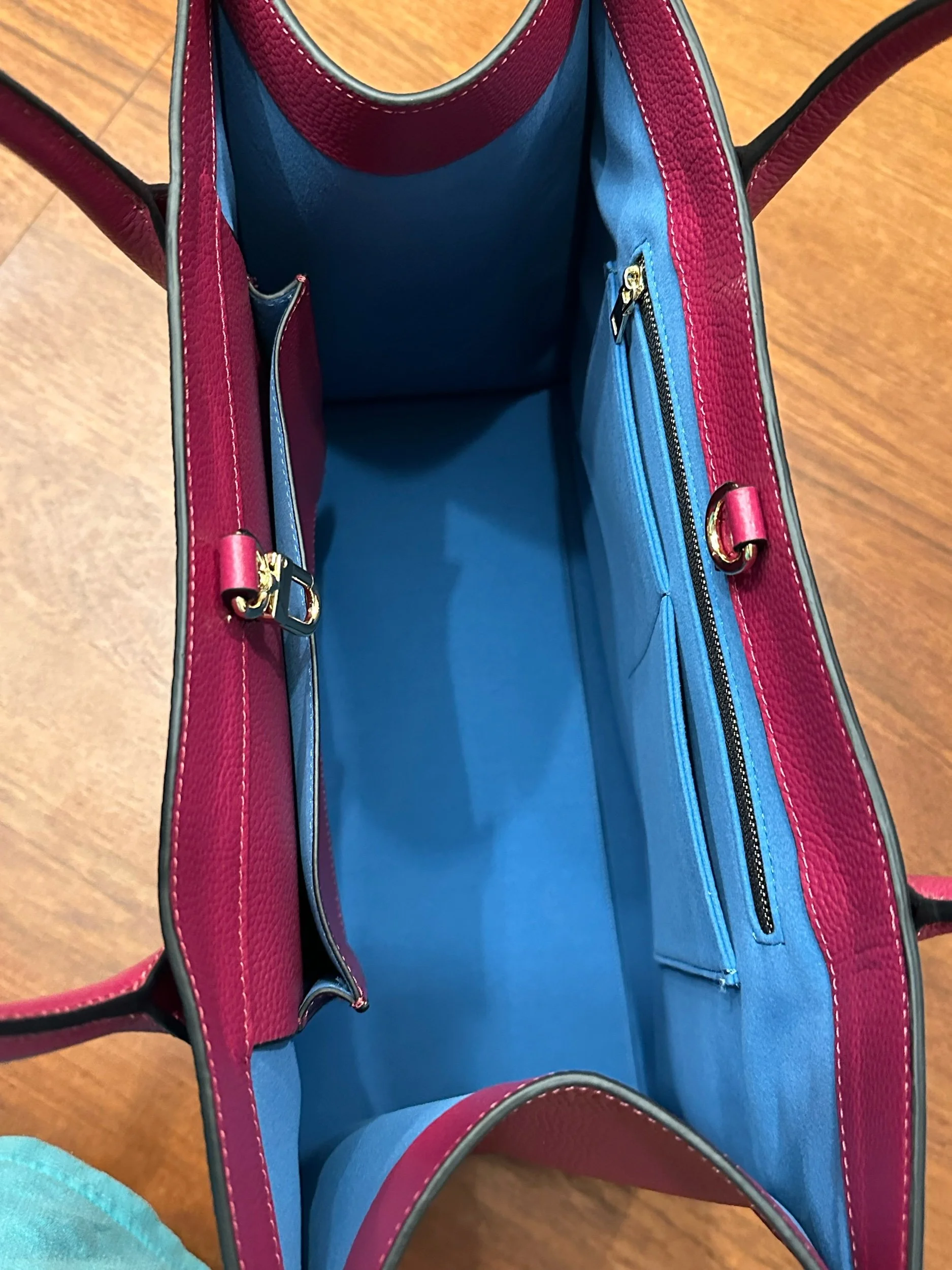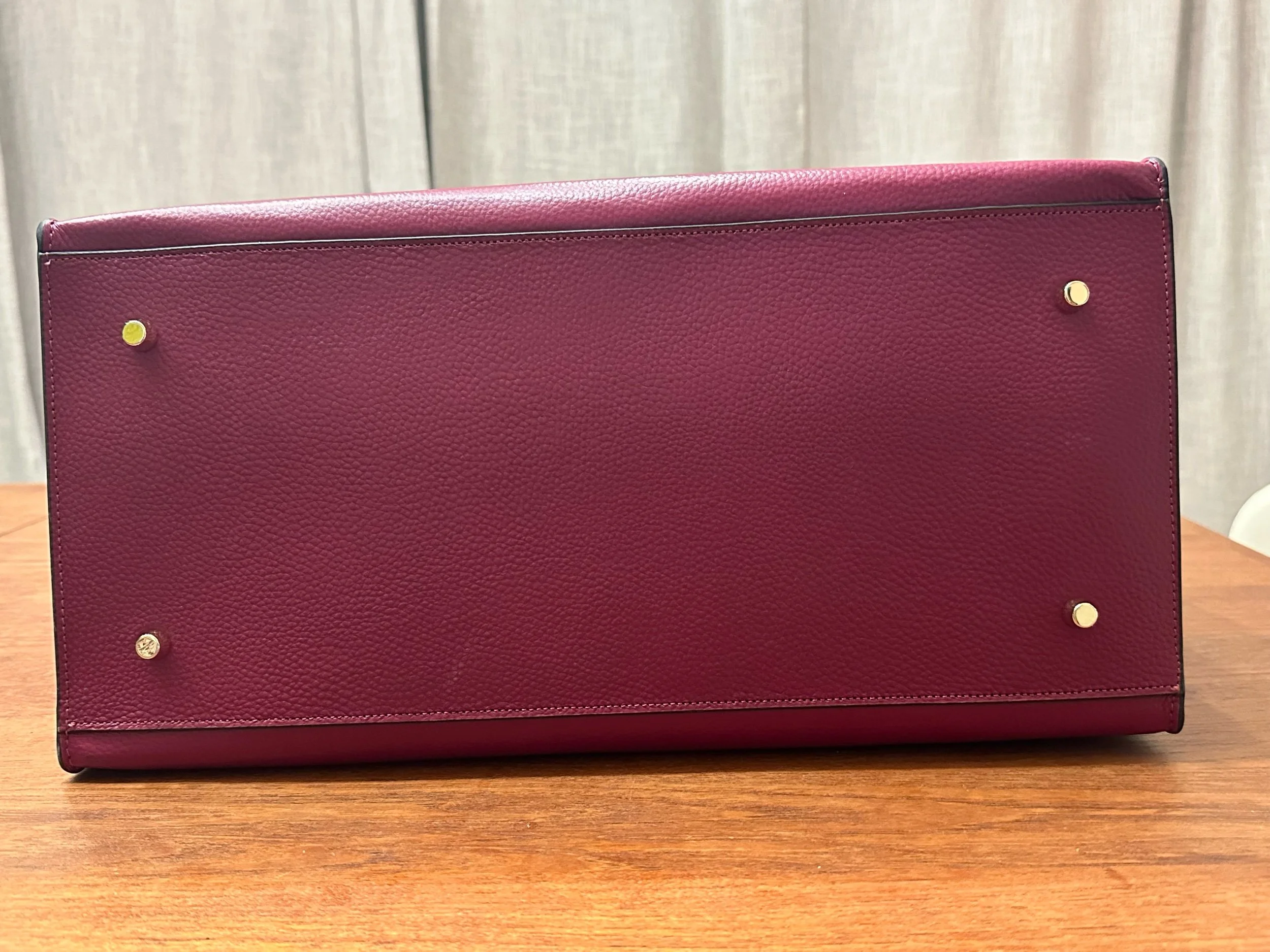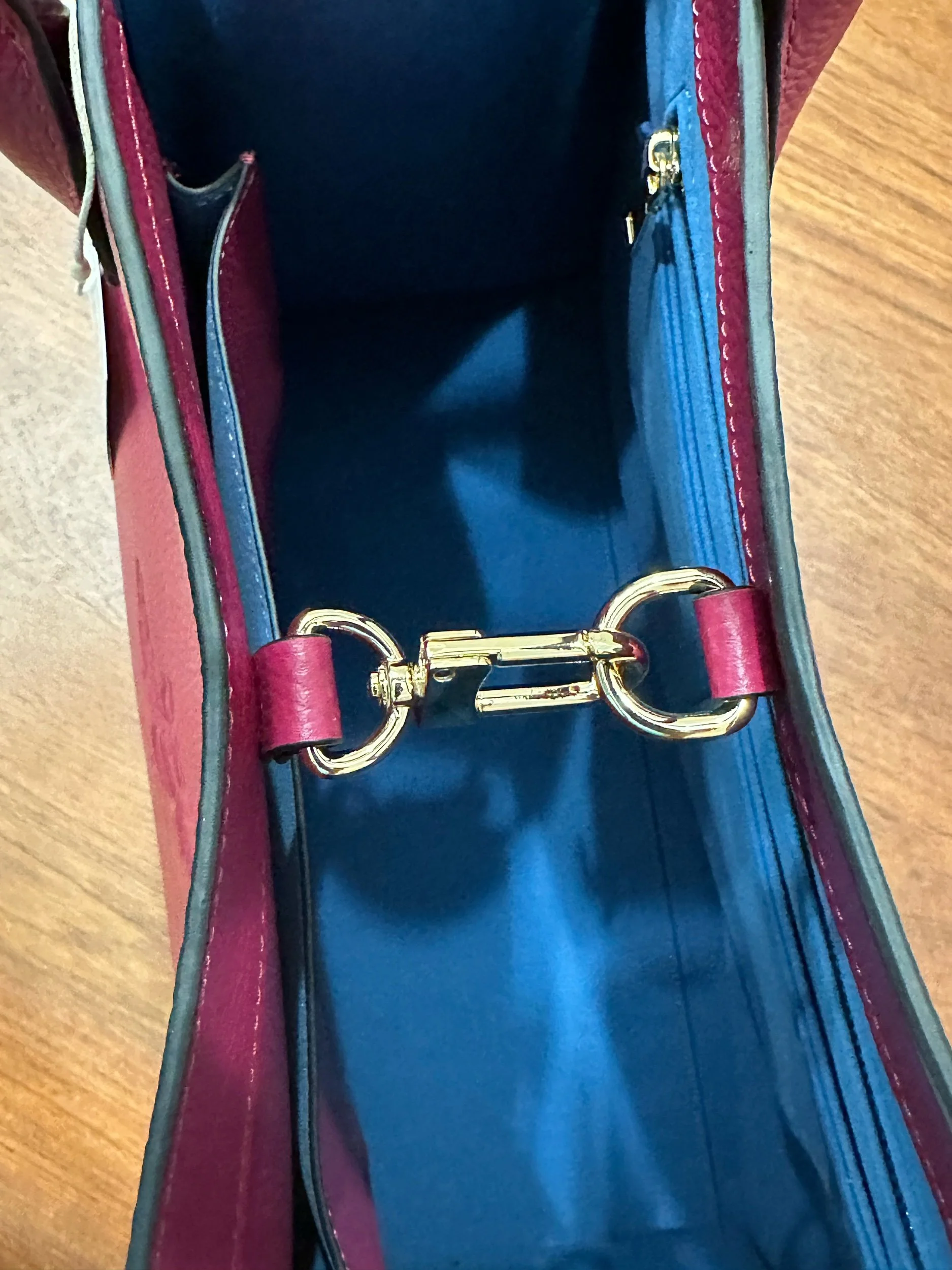 Made with Genuine Leather this tote bag is perfect for travel, work, grocery store, and life’s everyday needs. The interior lining is made from a micro suede complete with four pockets, one which has a zipper . The interior is easily cleaned with a wet cloth . Bag closes with a U-hook closure that also doubles as a keychain holder. This feet on the bottom of this bag provide a secure and protected placement . Measures 23” Height x 15.5” Long x 8” Wide
