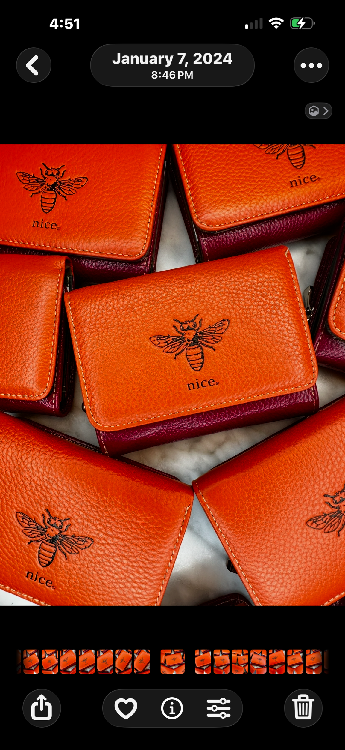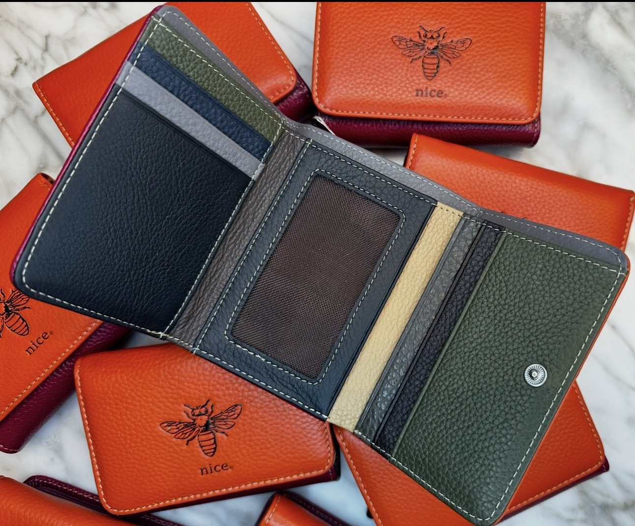 π§‘ππ©· Bee Nice Genuine Leather Wallet π§‘ππ©· Limited Edition of 100 created π§‘ππ©· Each walletβs interior is designed with five card pockets, cash spot , & two coin pockets with a zipper π§‘ππ©· Every single wallets interior is one of a kind with different colors creating each of the pockets π§‘ππ©· Interior is made with Eco friendly reclaimed leather from the cut patterns π§‘ππ©· Wallet closed measures 4.5β x 3.5 β x 1.5β Open Wallet measures 9βx 4.5 β x 1.7.5 β
