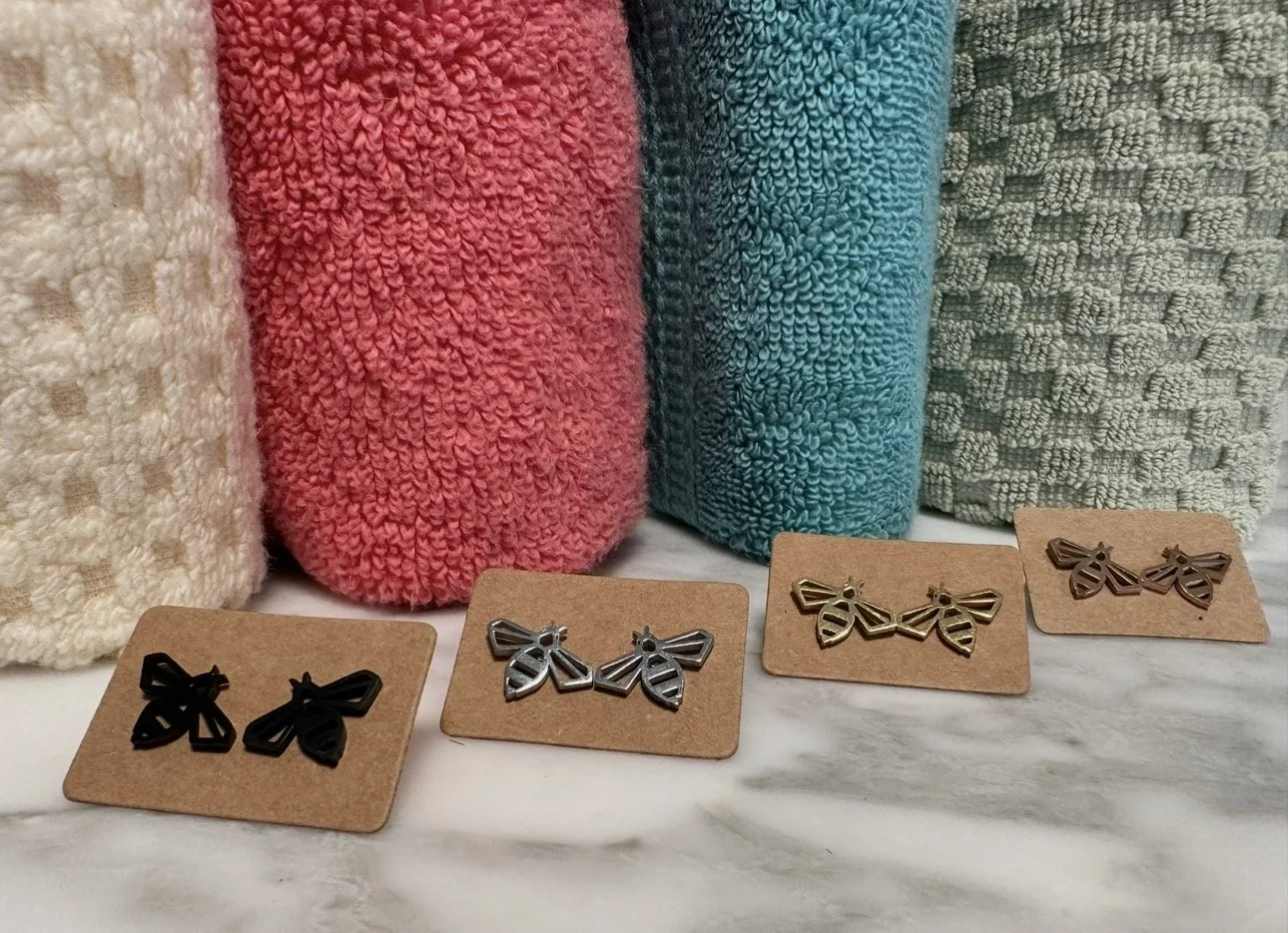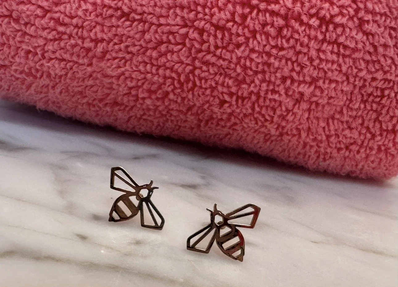 Merch › Bee Stud Earrings Image 1 of 5 Image 2 of 5 Image 3 of 5 Image 4 of 5 Image 5 of 5 Bee Stud Earrings $10.00 Stainless Steel with 18kt Yellow gold , Rose Gold , Silver or Black Titanium. Electro magnetic plating. Color: Yellow Gold Rose Gold Black Silver Add To Cart Added! Stainless Steel with 18kt Yellow gold , Rose Gold , Silver or Black Titanium. Electro magnetic plating.